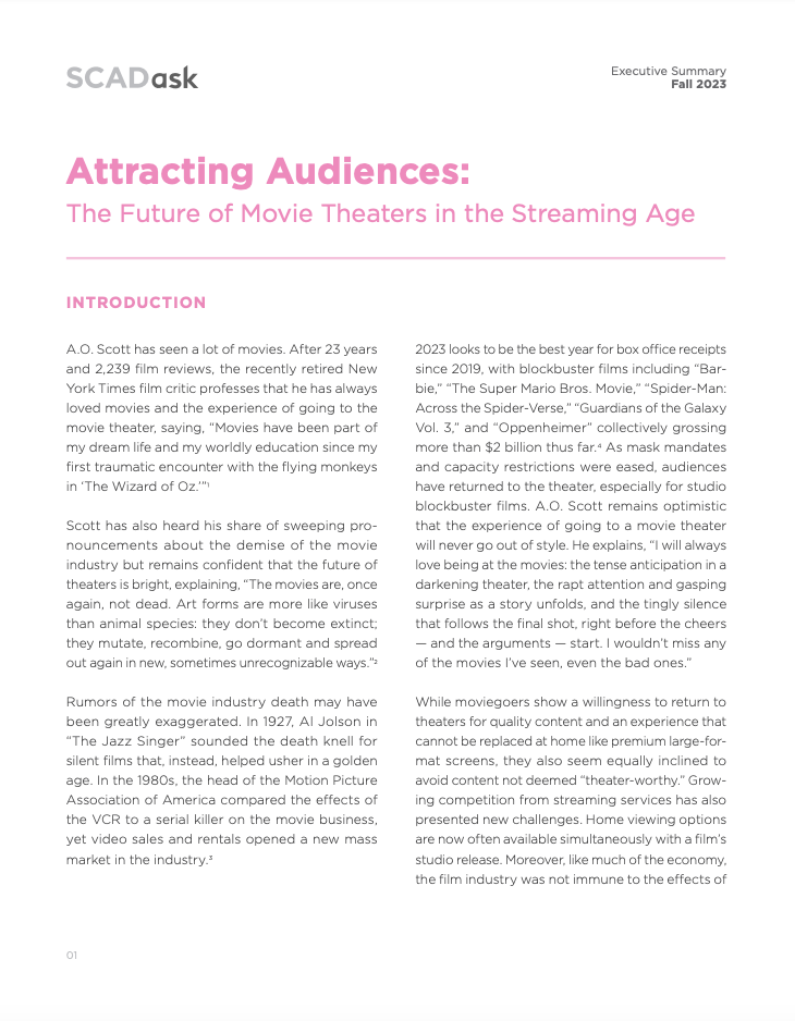 Though pronouncements about the demise of movie theaters have been routine in film history — from the end of the silent-film era to the advent of home video formats like VCR and DVD — the COVID-19 pandemic nearly did become the death knell for movie houses. Domestic box office revenues cratered from $11.9 billion in 2018 to $2.3 billion in 2020, and many studios shifted their film premieres to a hybrid model, offering a limited screening window in favor of expanded, earlier streaming options. A SCADask research team surveyed the entire SCAD student population, more than 17,500 students, about their theater experiences and viewing habits. Even with 86% of respondents reporting the importance of films in their lives, the overwhelming majority — more than 75% — preferred streaming options over trips to the theater. In further industry research, the SCADask team posited that theaters must pivot to marketing special experiences, like creative food and beverage options, diverse community events, special screenings, and more to captivate audiences again.