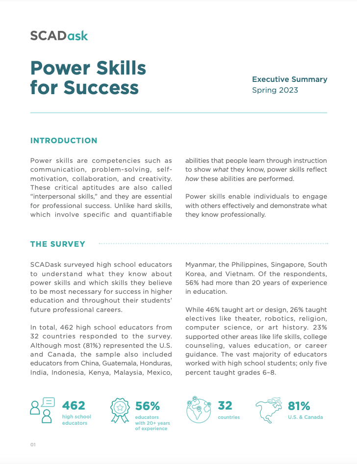 Power skills like communication, problem-solving, self-motivation, collaboration, and creativity are essential for academic and professional success. SCADask surveyed more than 450 high school educators to identify the power skills most beneficial to their students as they pursue higher education and postgraduate employment. Respondents from 32 countries highlighted key skills such as communication, adaptability, and self-motivation for success. Surprisingly, many in the survey group regarded self-motivated students as the hardest of their cohort to teach, opening an avenue for deeper introspection on how this skill should be taught and developed. The survey responses set up for future research to evaluate the type of coursework and support systems that would encourage further development of these crucial skills at the college level.