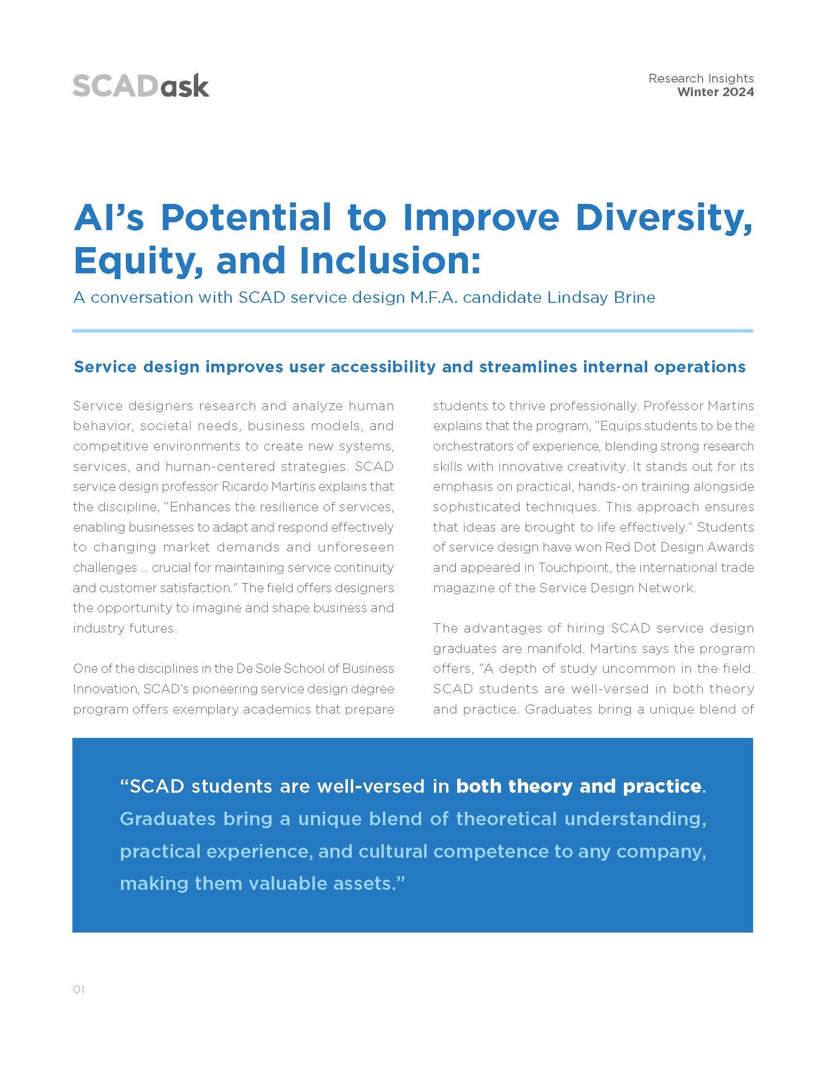 On a global scale, service design offers the opportunity to shape business and industry futures through the examination and analysis of human behavior, societal needs, business models, and competitive environments to create new systems, services, and strategies. With a cadre of AI agents available for personal and business use — among them ChatGPT, Adobe Firefly, Midjourney, and Claude — the human-centered design approaches pioneered in service design may hold the answer for harnessing these nascent technologies for inclusive, positive change. SCAD graduate student Lindsay Brine (M.F.A. service design) has already seen the benefits of "design for good," participating in SCADpro partnerships with NASA developing strategic outreach initiatives for a satellite launch and with the Savannah Tree Foundation synthesizing mixed-method research to improve tree canopy equity in the city. Since then, Brine has researched how the service design perspective can offer a path toward leveraging AI tools to generate responsible, inclusive solutions.