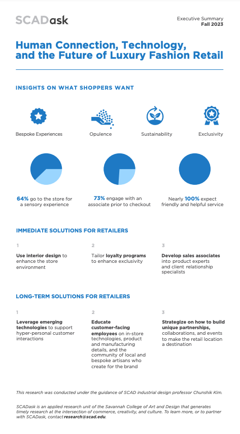 Under the guidance of SCAD industrial design professor Chunshik Kim, SCAD students conducted research exploring human connections to technology within the luxury retail space. Consumers indicated exclusivity, sustainability, opulence, and bespoke experiences as key parts of the in-person shopping experience. Student researchers identified solutions that enable brands to leverage emerging tech and design thinking, elevating the customer experience through features like enhanced interior design, exclusive loyalty programs, and the use of emergent technology to personalize customer interaction. These solutions present the opportunity to build unique partnerships and collaborations that transform storefronts into sought-after destinations.