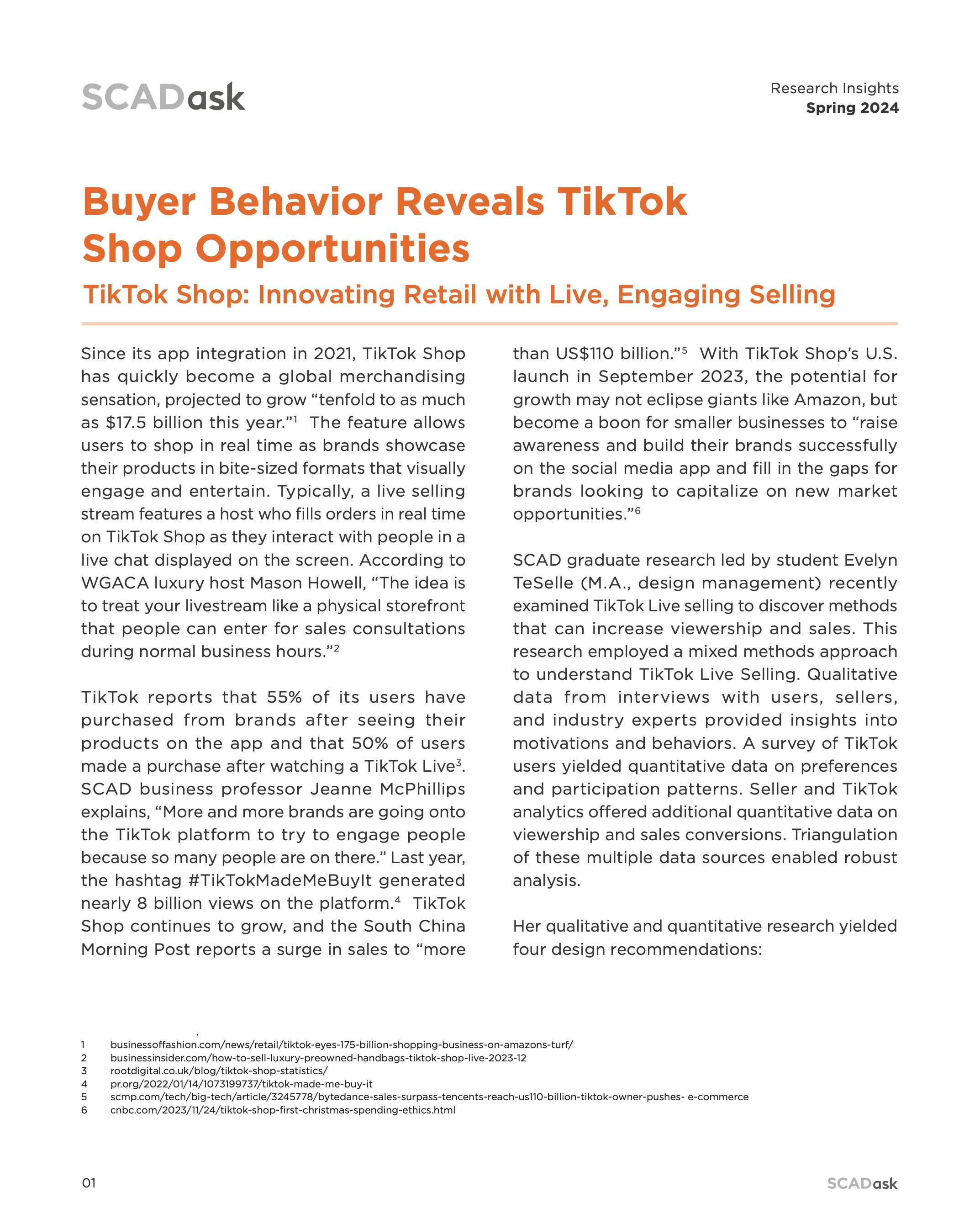 TikTok Shop offers users of the popular social media app a direct way to purchase products through videos and livestreams. Since its integration in 2021, TikTok Shop has grown tenfold, with projections reaching $17.5 billion in sales this year, according to The Business of Fashion. SCAD design management graduate student Evelyn TeSelle surveyed TikTok users, examined seller and TikTok analytics, and interviewed industry experts to create recommendations on how the platform can expand its consumer reach and enhance the browsing and purchasing process. Her recommendations included adding options to join seller livestreams anonymously, as a majority of those surveyed rarely interacted with the live chat; incorporating robust buyer protections and streamlining the buying process to increase user trust; and creating a dedicated page to explore livestreaming sellers, among others.