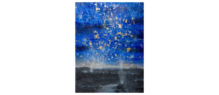 Meko’s immersive paintings evoke turbulent skies, undulating seascapes, and billowy marshes with spray-painted gestural markings, while also incorporating forms and navigational lines in white color pencil and beacons of gold leaf sparkling in the night sky. The artwork’s inky palette and the exhibition’s title, So Black and So Blue, take inspiration from Louis Armstrong’s interpretation of the jazz standard “(What Did I Do to Be So) Black and Blue,” Ralph Ellison’s evocation of the song’s racial protest dimensions, and Imani Perry’s groundbreaking text Black in Blues: How a Color Tells the Story of My People. Contextually and lucidly, Meko maps an optimistic framework of resilient expedition and profound change.