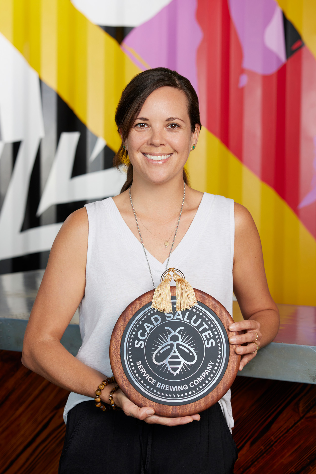 Service Brewing Co. co-founder and creative marketing director Meredith Sutton receives the SCAD Salutes award. Since the company's founding, Sutton and husband, co-founder, and military veteran Kevin Ryan have raised more than $100,000 for local, regional, and national organizations that support service members and first responders.
