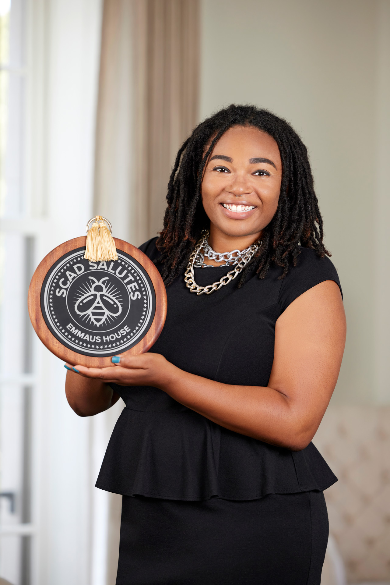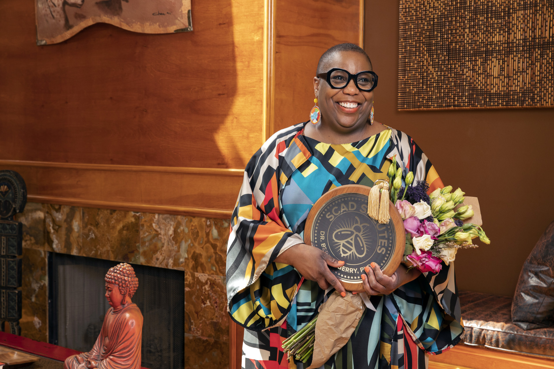 Bertice Berry, sociologist, author, and owner of NDND Designs, poses with the SCAD Salutes award. Through NDND Designs, Berry and her team sent thousands of masks throughout Savannah and the U.S. to health care workers during the COVID-19 pandemic.