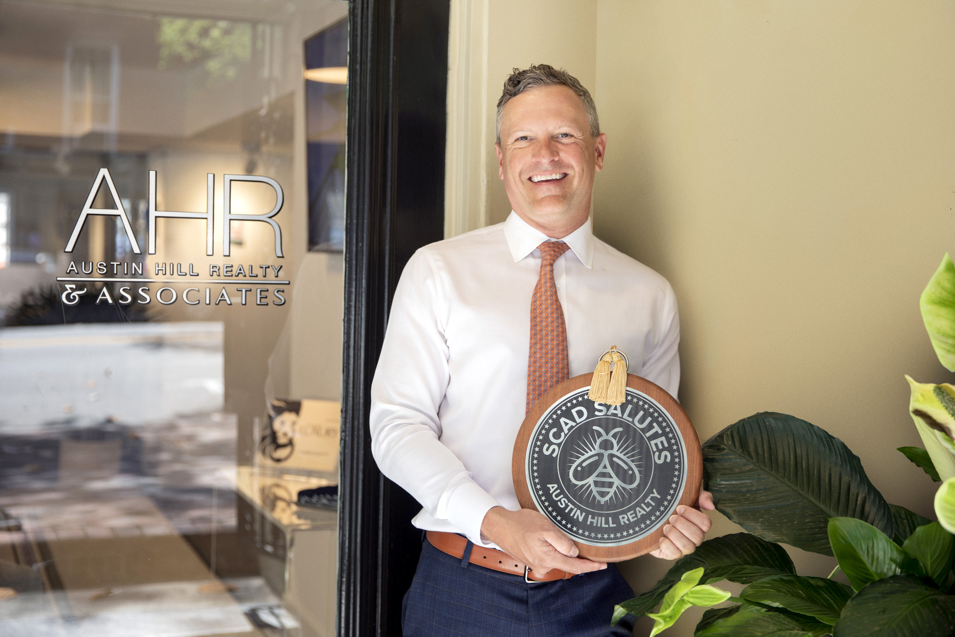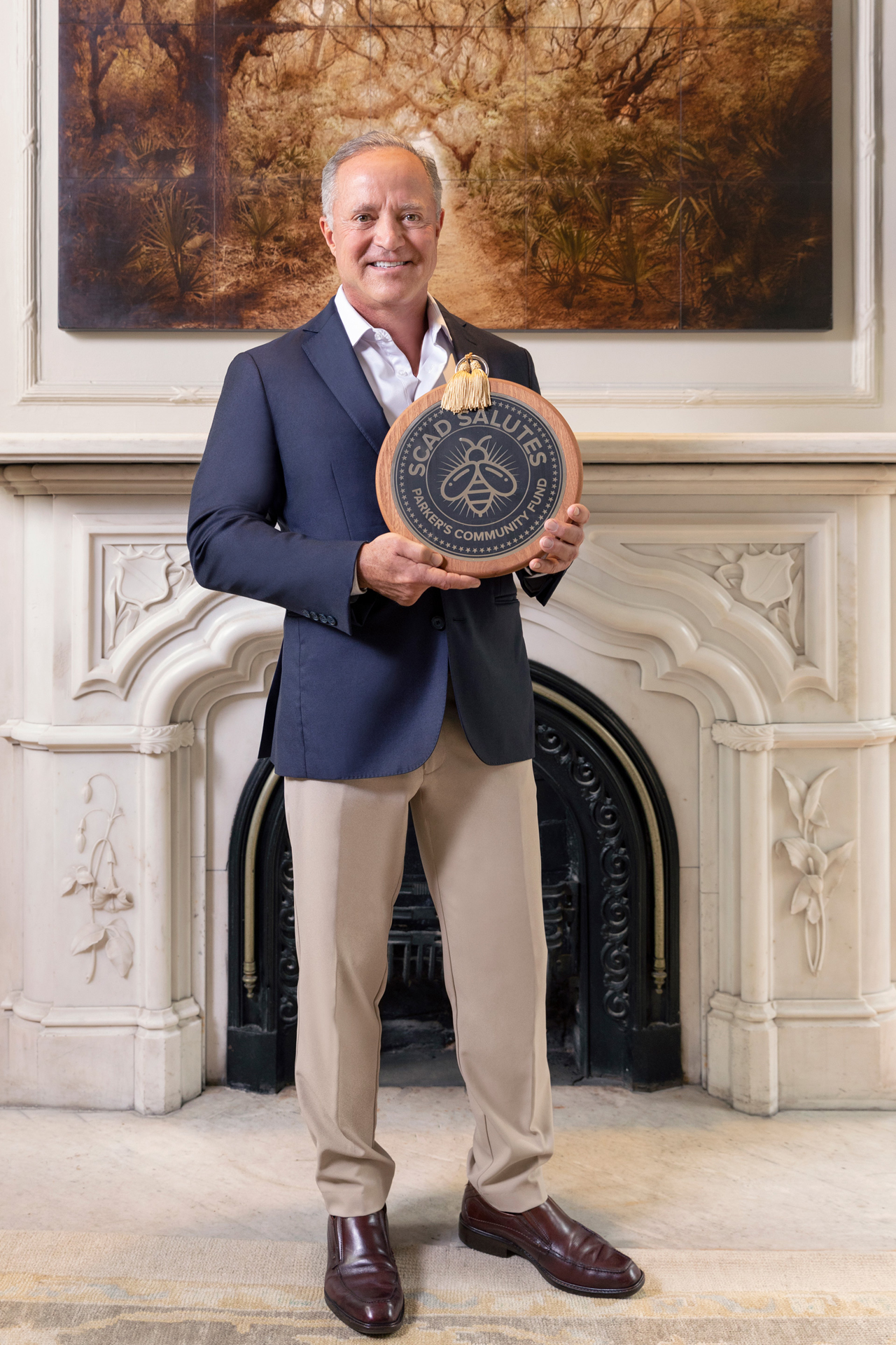 Austin Hill, founder of Austin Hill Realty, poses with the SCAD Salutes award. The boutique real estate firm has served the Savannah area for more than 40 years and continues its legacy of community-minded business with its Location Gallery, which features works from local artists, including SCAD students, faculty, and alumni, and donates half of its profits to area charitable organizations.