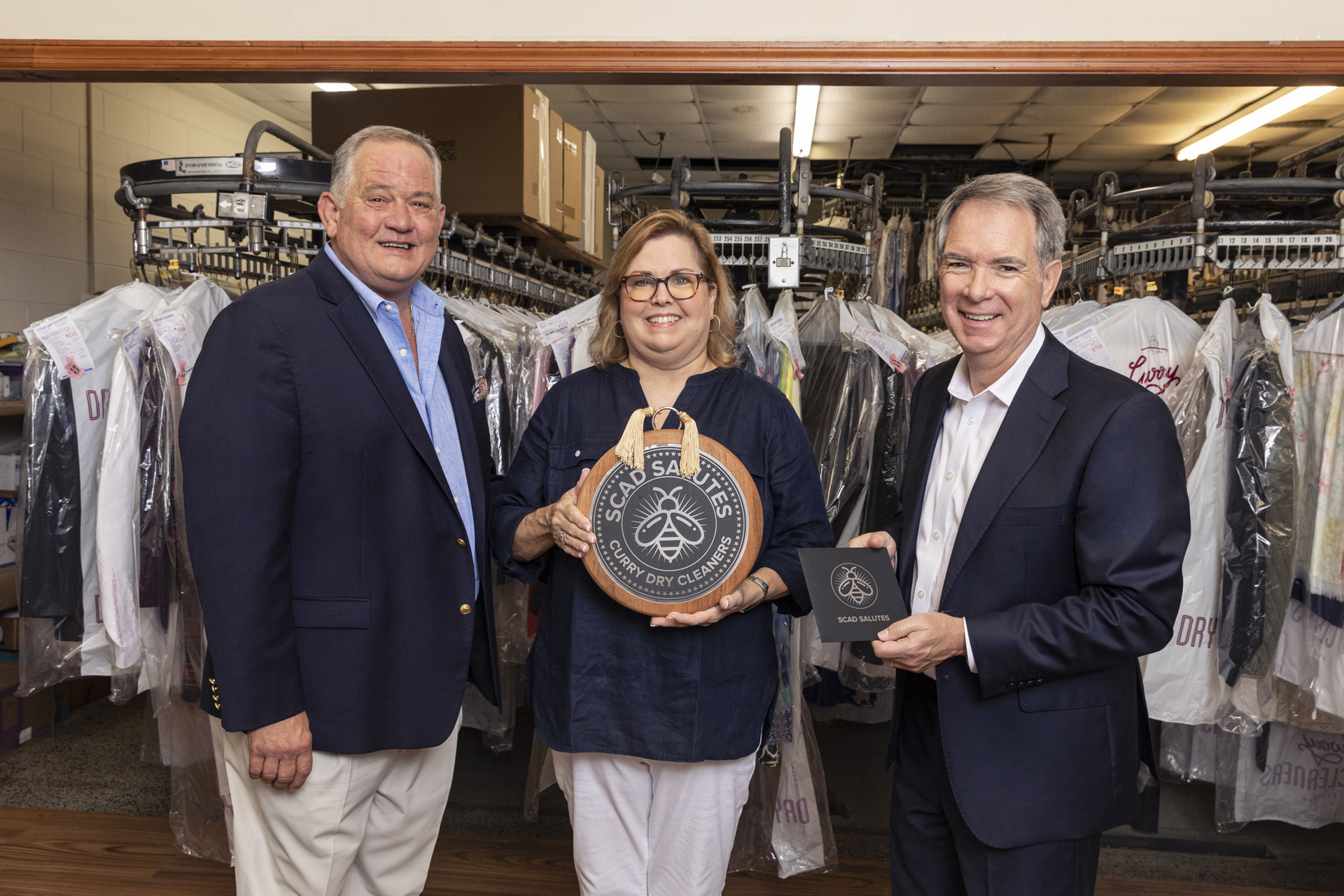 For more than 75 years, Curry Dry Cleaners has served Savannahians with courtesy, care, and quality. Owners John and Lisa Curry receive the SCAD Salutes Award from Danny Filson, executive director of SCAD executive administration.