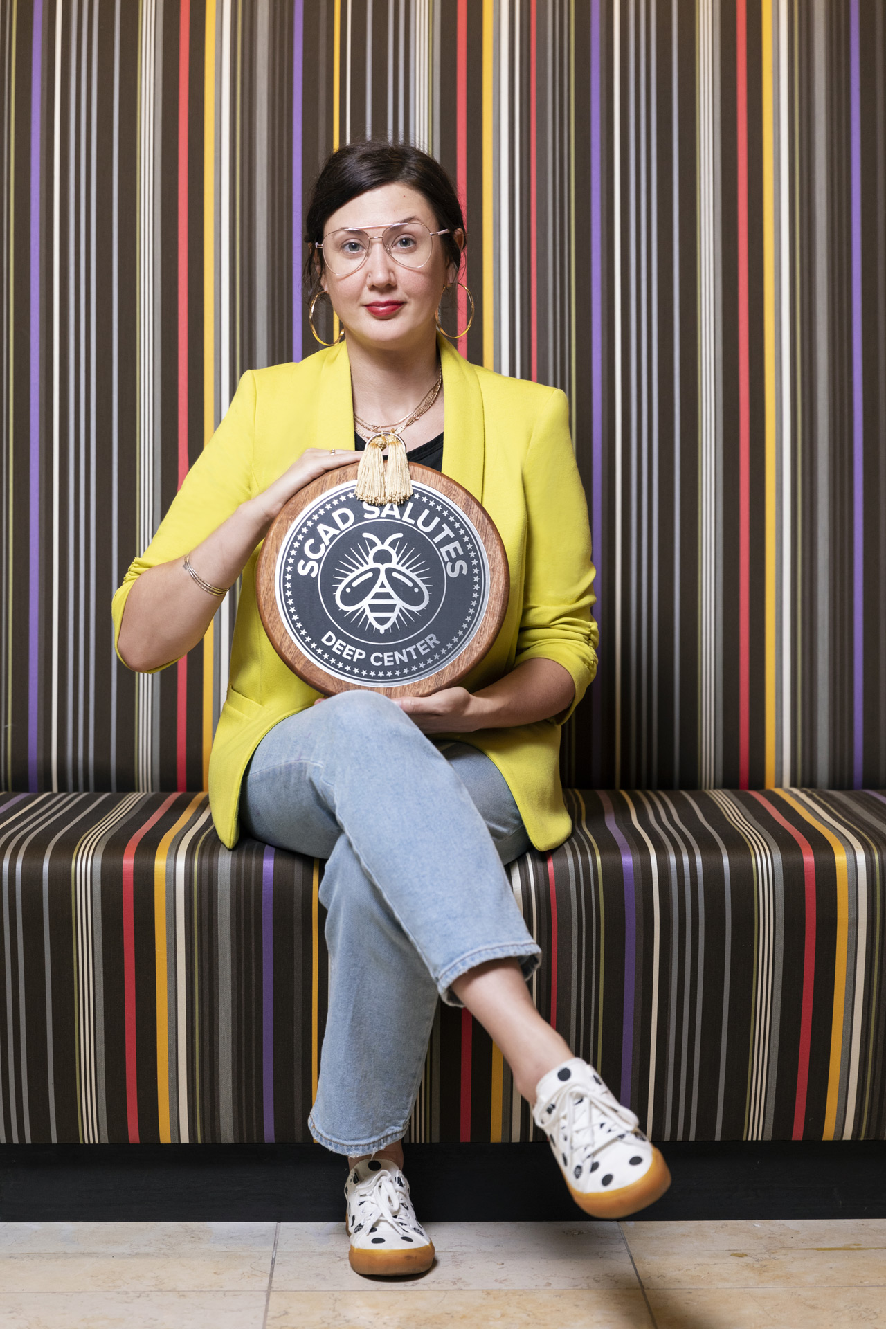 Deep Center director of development and communications Coco Papy is shown with the SCAD Salutes award. SCAD honors the Deep Center for its ceaseless work to empower underserved youth across Savannah through arts and the written word, igniting confidence in literacy and leadership for thousands since 2008.