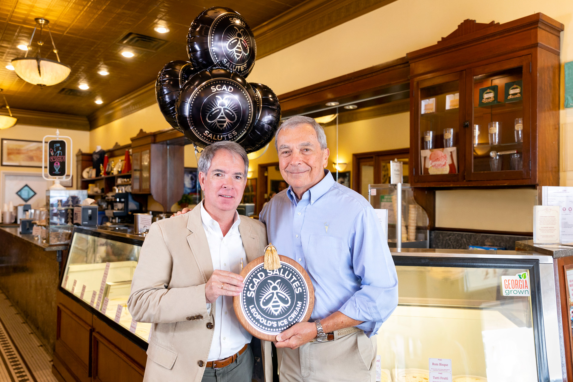Danny Filson, SCAD executive director of executive administration, presents Stratton Leopold, owner of Leopold's Ice Cream, with the SCAD Salutes award. Leopold's has doled out delectable desserts, sweet scoops, and other tasty treats for more than a century, a family legacy that continues to draw in visitors from around the world.