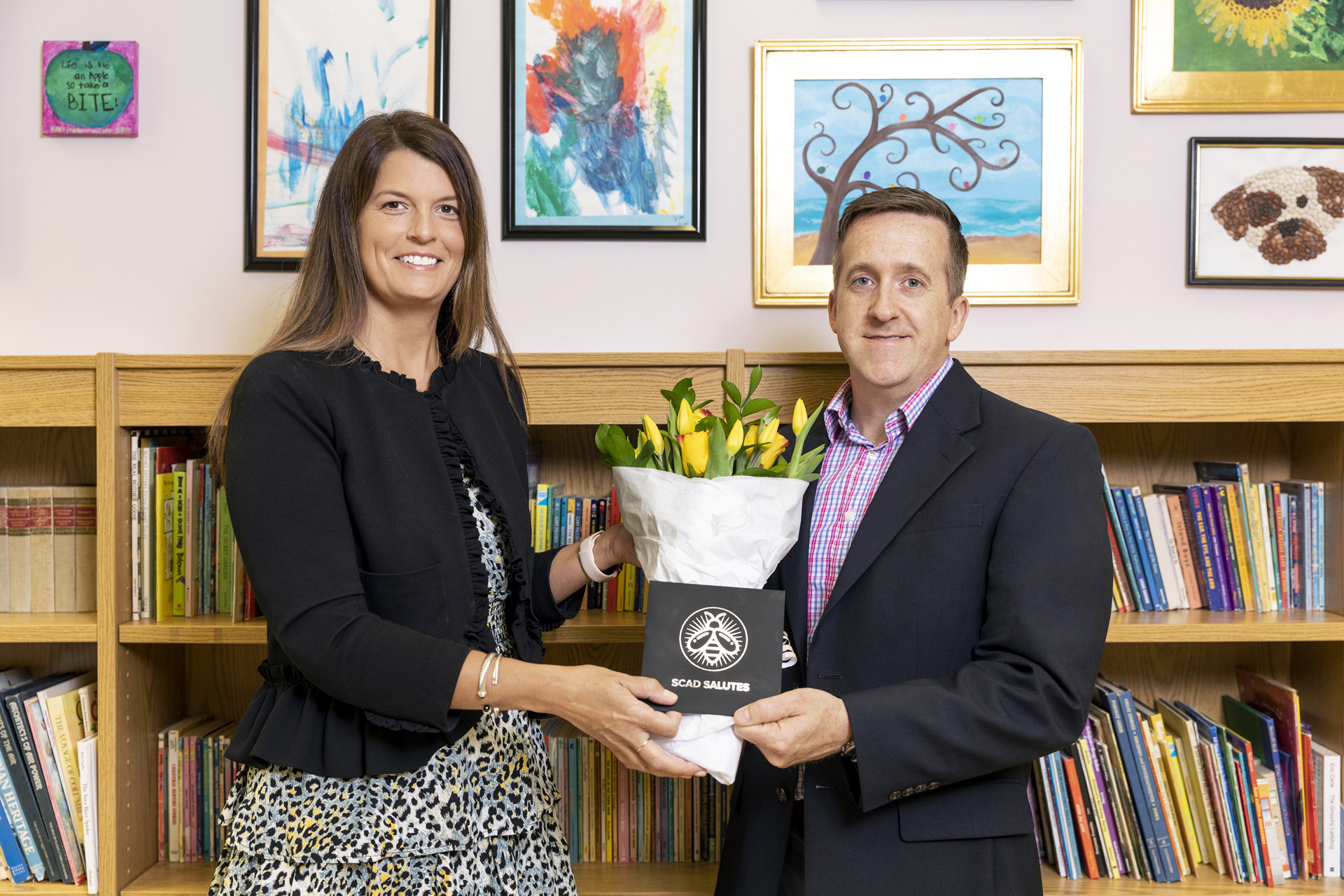 SCAD Executive Director of Communications Michelle Gavin presents the SCAD Salutes award to Jack O'Connor, president and CEO of the Matthew Reardon Center for Autism. Operating one of Georgia's few year-round, accredited day schools for individuals with autism, MRCA serves as an advocate for children with autism and their families and as a resource for community leaders for autism-related training.