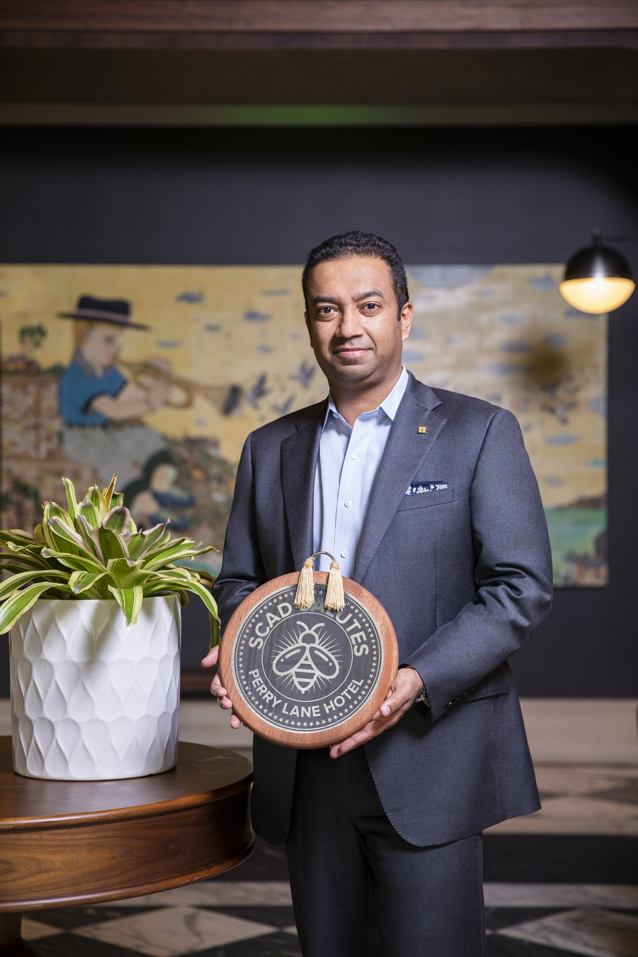 Pritpal Singh, general manager of luxury hotel Perry Lane, poses with the SCAD Salutes award.