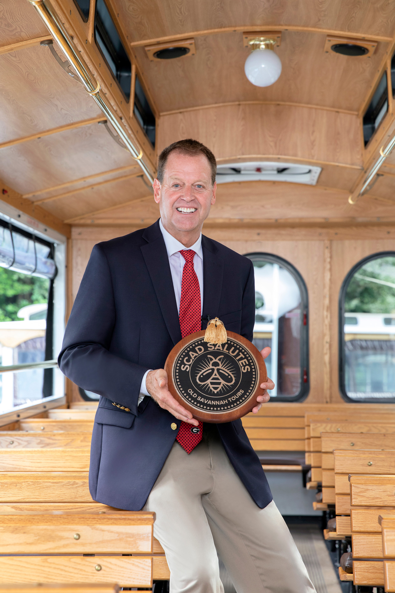 Charles Brazil, regional manager for Historic Tours of America, which includes the Old Town Trolley Tours of Savannah, receives the SCAD Salutes award. Old Town Trolley Tours delights local Savannahians and visitors alike with tales of more than 100 of the city’s most interesting locations.
