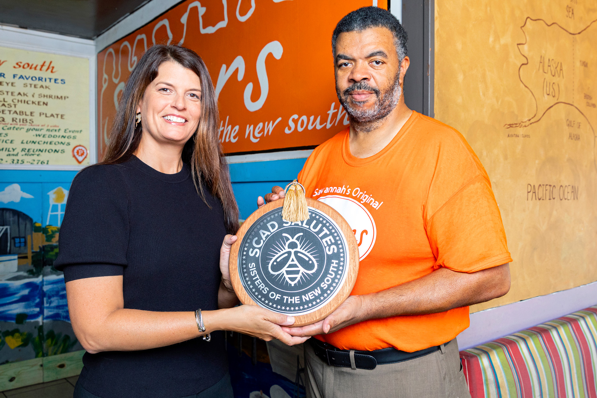 Sisters of the New South owner Kenneth Brown receives the SCAD Salutes award from Michelle Gavin, SCAD executive director of communications. This homestyle restaurant delights patrons with delicious Southern cuisine made from scratch using recipes passed down for generations.