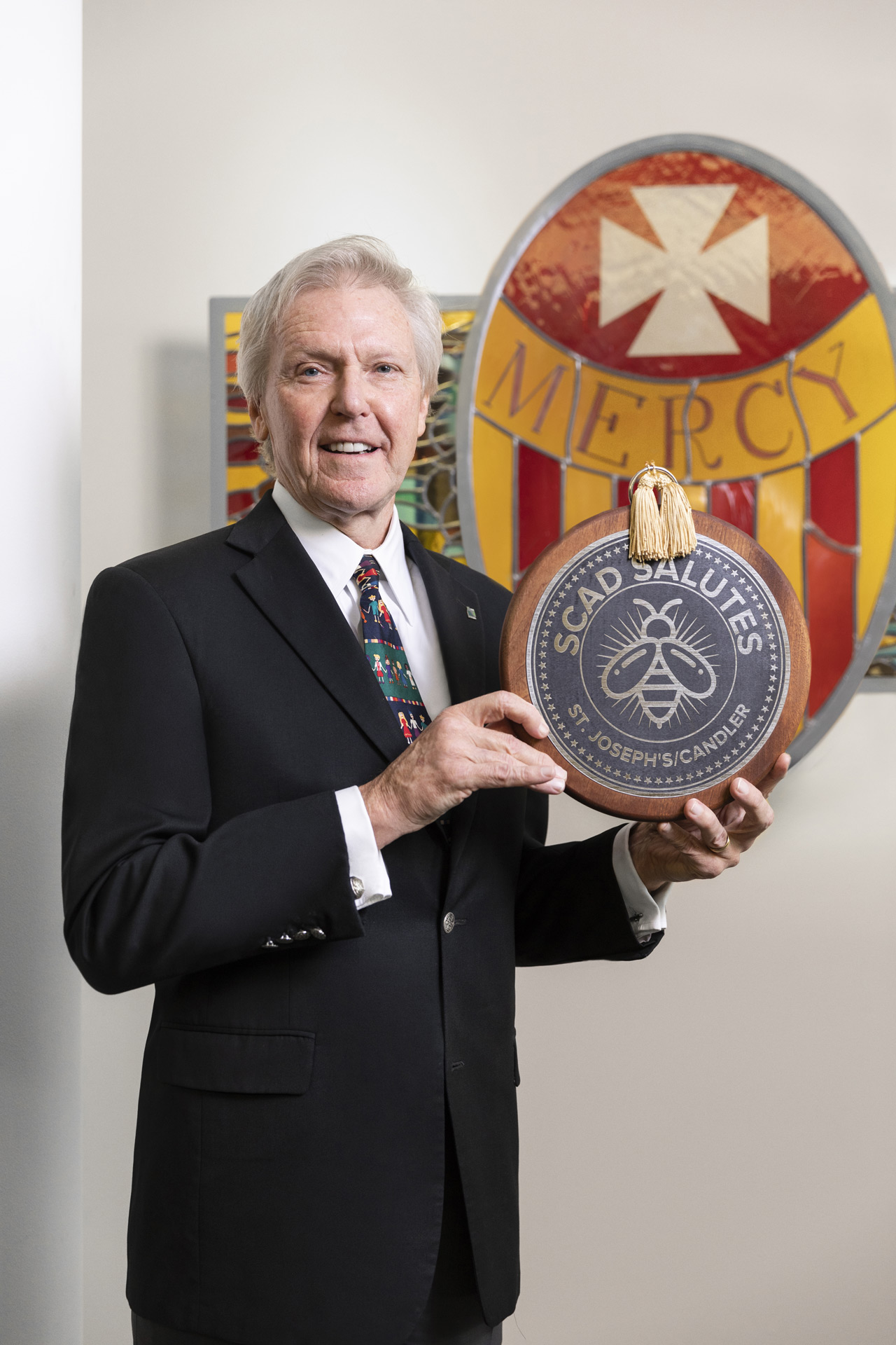 Paul Hinchey, president and CEO of St. Joseph's/Candler, poses with the SCAD Salutes award. SCAD honored St. Joseph's/Candler for its championing of health and well-being for communities across the Southeast, including increased vaccine education and critical service advocacy for marginalized populations.